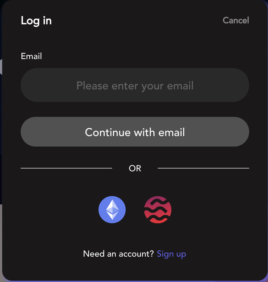 Click \[ Sign up] in the upper right corner and sign up with Email, EVM wallet and Sei wallet in the pop-up window.
