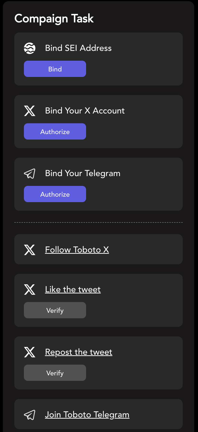 * Bind account include EVM address, Sei address, Email, Twitter, Telegram;